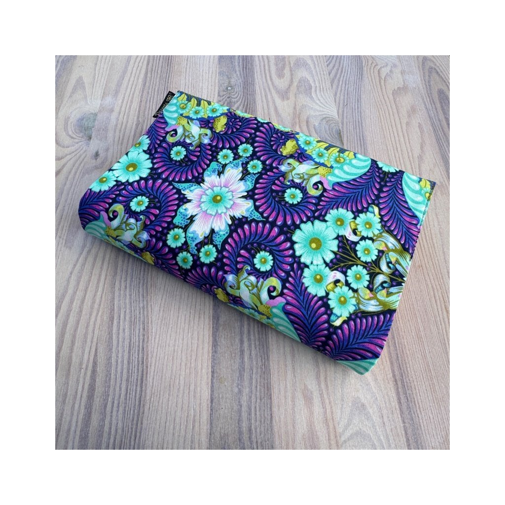 Textilní obal na knihu naší ruční výroby. Obal na knihu je ušitý z vysoce kvalitní bavlny. Jedinečný a originální vzhled obalu na knihu je zaručen pečlivým výběrem lícové a rubové látky. Samozřejmostí je všitá záložka.